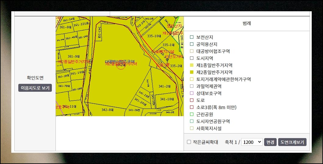 토지이용계획확인원에는 구역별 성격을 컬러로 나눈 도면도 포함돼 있어요. 숲 지대는 초록, 거주 영역은 노랑, 특별 관리 지대는 별도 톤으로 칠해져 있습니다. 배색만으로도 각 필지의 지정 목적을 직감적으로 읽어낼 수 있어요.