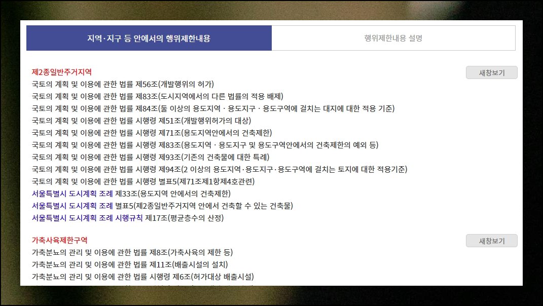 토지이용계획확인원 무료열람 화면에는 해당 필지에 묶인 제한 조건도 표기되어 있어요. 초기 화면에선 핵심만 압축해서 보여줍니다. 추가 정보가 궁금하면 관련 줄을 눌러 상세 내역을 꺼내볼 수 있어요.