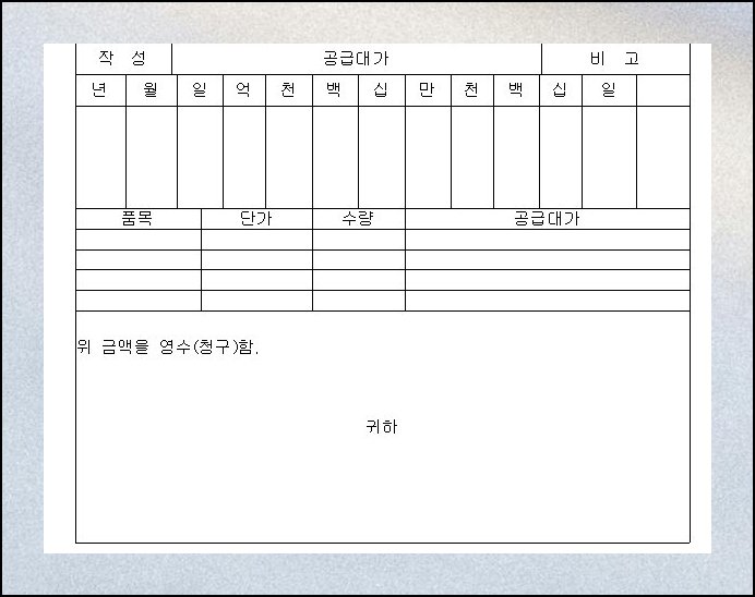 아래에 양식 파일을 직접 첨부해 두었으니 별도로 검색하실 필요가 없습니다. 공급자용과 공급받는 자용 영수증이 한 문서에 함께 담겨 있어 따로 구할 번거로움도 없어요. 다운로드 후 바로 내용을 채워 넣으면 되니 처음 작성하시는 분도 어렵지 않게 완성할 수 있습니다.