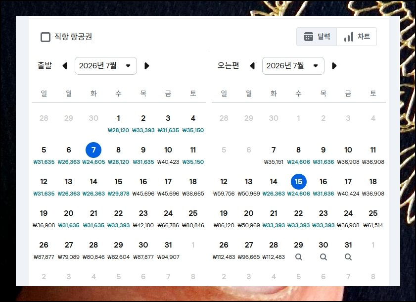 검색을 실행하면 월간 일정표 모양으로 각 날의 최소 운임이 나란히 표시됩니다. 항공권 가격이 날짜마다 크게 달라지기 때문에 이 달력을 잘 활용하는 방법이 중요해요. 예산 관리가 우선이라면 금액 기준으로 출발일을 결정하는 편이 싸게 티켓을 잡는 지름길입니다.
