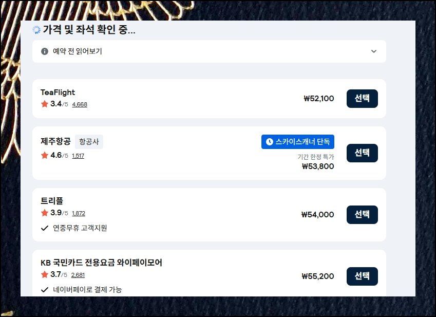 마음에 맞는 편을 골랐다면 곧바로 구매 절차로 진입할 수 있어요. 이어지는 페이지에 여러 판매 채널이 나열됩니다. 방법은 심플하죠. 낮은 금액부터 차례로 보여주는 목록 최상단을 택하면 돼요. 동일 조건이라면 고객 평가가 우수하거나 부가 서비스가 풍부한 곳을 우선하는 것이 항공권을 싸게 구입하는 또 하나의 방법입니다.