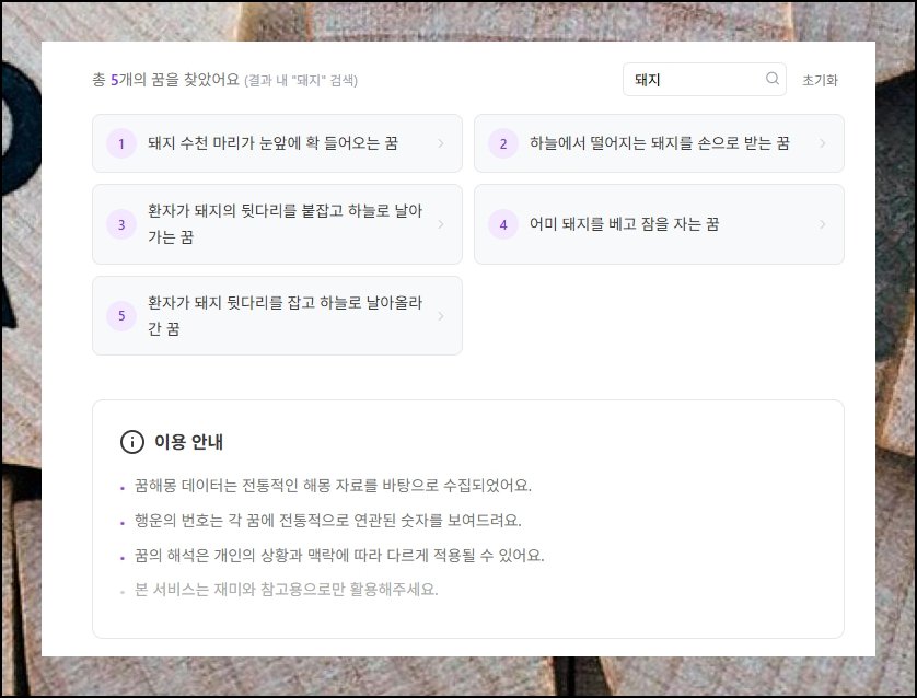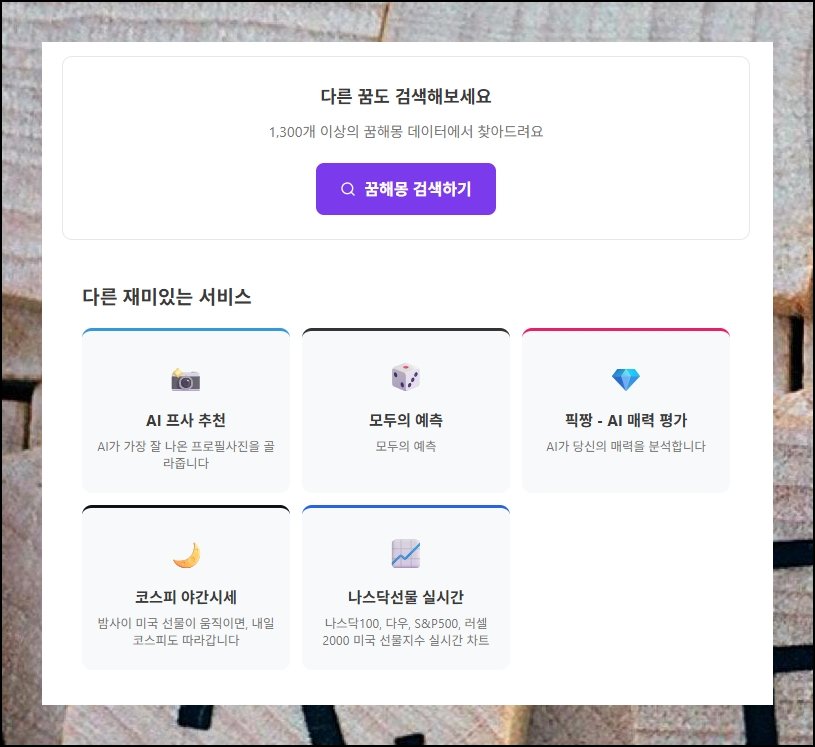 축적된 꿈해몽 자료가 이미 천삼백 건을 넘어섰습니다. 태몽이나 좋은 징조 그리고 나쁜 징조처럼 성격별 구획이 나뉘어 있어 흥미로운 영역만 골라 탐색 가능해요. AI 인물 이미지 제작이나 야간 증시 현황 조회 같은 부가 서비스도 마련돼 있어 둘러볼 거리가 넉넉합니다.