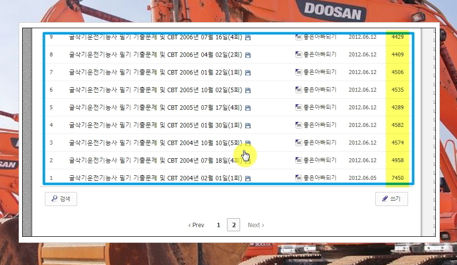메인화면에서 자격증 이름을 클릭하면 다음과 같은 굴착기 필기 기출문제 자료실이 열립니다. 연도와 회차에 따라 구분이 되어 있는데요. 여기에 표시되어 있는 조회수를 보면 알 수 있듯이 꽤 많은 사람들이 필기시험 준비를 위해 이곳의 자료를 이용했습니다.