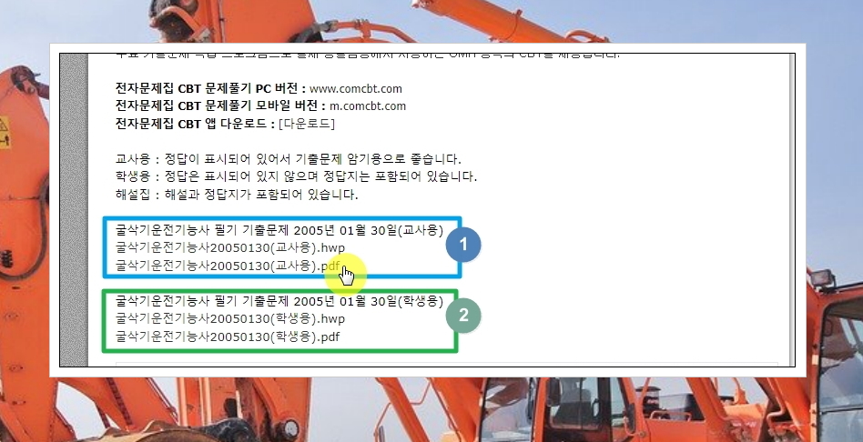 이곳에서 제공하는 기출문제 자료는 크게 4가지로 나뉘어 집니다. 학생용과 교사용, HWP 파일과 PDF 파일을 기준으로 구분이 되어 있는데요. 자신의 실력을 테스트 하는 용도라면 학생용 자료를 이용하면 되고, 굴착기 필기시험 전날에 많은 양의 기출문제를 훑어보고 싶은 경우에는 교사용 자료를 이용하면 됩니다. hwp와 pdf 선택에 있어서는 자신이 사용하는 컴퓨터에 아래아 한글 프로그램이 설치되어 있다면 hwp를 선택하면 되고, 그렇지 않다면 pdf 파일을 선택하는 것이 좋습니다.