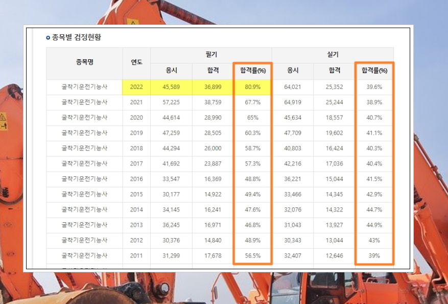 2011년부터 2022년까지 응시 인원, 합격 인원, 합격률 현황을 살펴보았습니다. 필기시험과 실기시험 사이에 약간의 차이가 있음을 알 수 있는데요. 대체로 필기가 실기보다 합격률이 높습니다. 2022년의 경우에는 필기시험의 합격률이 80.9%로 꽤 높은 수치를 나타냈는데요. 2022년을 제외한 나머지 연도를 살펴보았을 때 일반적으로 합격률은 45%~65% 수준임을 알 수 있습니다.