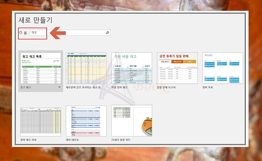 프로그램에서 '새로 만들기' 문구 아래에 '온라인 서식 파일 검색'이라고 적혀 있는 입력창이 있는데요. 여기에 '재고'라고 입력하고 엔터키를 눌러주세요. 그럼 다양한 재고관리 엑셀 서식이 나타난답니다. 창고 목록, 일별 판매 보고서, 장비 목록, 21세기 원형 차트, 재주문이 강조 표시되는 목록 등 다양해요.