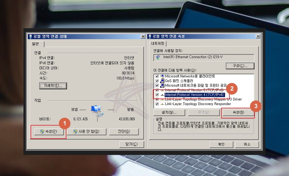 '로컬 영역 연결 상태'를 보시면 본인이 사용하고 있는 인터넷 프로토콜과 사용시간, 인터넷 속도 등이 나타나는데요. 속성을 눌러주세요. 관련 항목들이 여러 개 나오는데요. 고정 아이피 설정을 위하여 본인이 사용하고 있는 프로토콜을 선택하시면 됩니다.