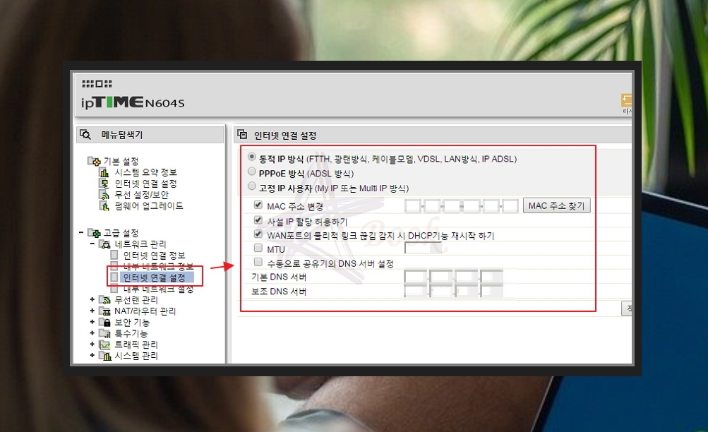 좌측에 보시면 메뉴탐색기가 있습니다. '고급 설정 ▷ 네트워크 관리 ▷ 인터넷 연결 설정'을 순차적으로 누르면 고정 IP를 설정할 수 있는 페이지가 나타나는데요. 많은 분이 광랜방식으로 인터넷을 사용하기 때문에 MAC 주소를 변경하는 방법을 사용하시면 됩니다.