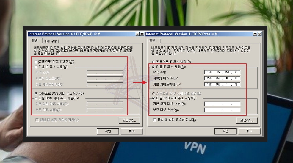 저는 유동 아이피를 이용하고 있기 때문에 '자동으로 IP 주소 받기'로 설정이 되어 있는데요. 여기서 고정 아이피를 이용하려면 오른쪽과 같이 입력하시면 됩니다. DNS 서버 주소를 모르신다면 자동으로 하셔도 됩니다.