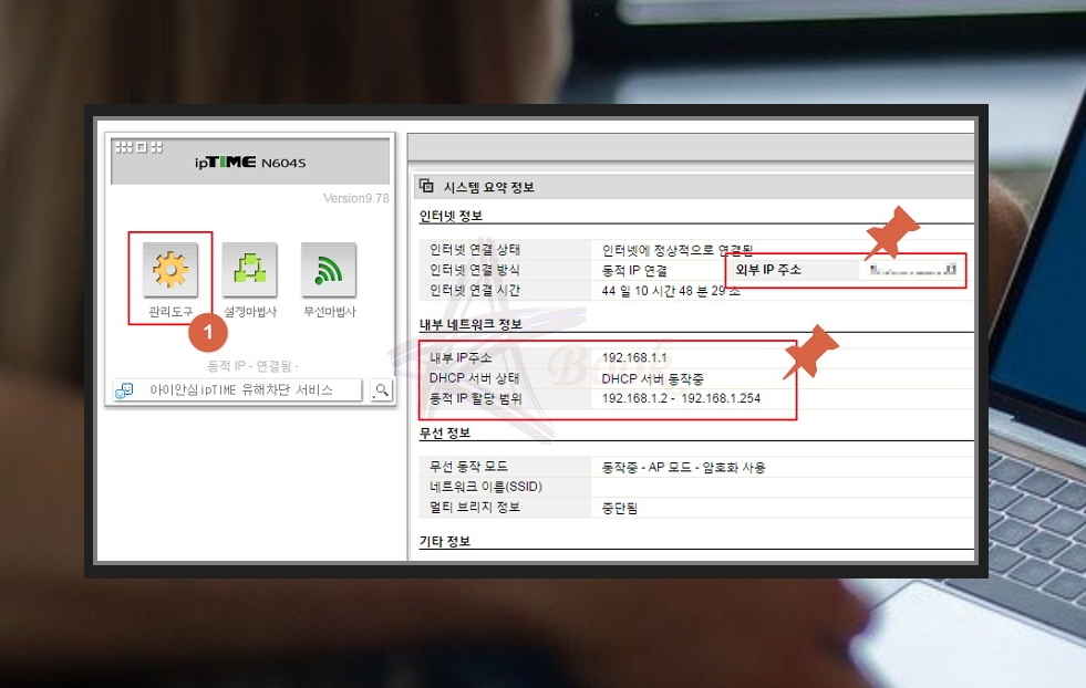 우리나라에서 많은 분이 Iptime의 제품을 많이 사용하는 관계로 Iptime을 기준으로 설명해 드리도록 하겠습니다. 일단 인터넷에서 192.168.1.0 또는 192.168.1.1을 입력해 주세요. 그럼 공유기 전용 프로그램이 나타난답니다. 여기서 관리도구를 눌러 아이피를 고정으로 설정할 수 있습니다.