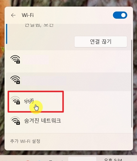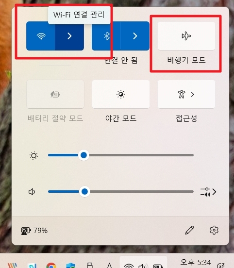 3. 이번에는 바탕화면에서 우측 하단을 보면 작업 표시줄이 있습니다. 여기에서 인터넷 모양의 아이콘을 클릭해 보세요. 그럼 여러 가지 인터넷 관련 표시가 나타나는데요. 여기에서 와이파이 연결 관리를 선택합니다. 참고로 비행기 모드가 되어 있으면 네트워크 연결이 제대로 되지 않아요. 비행기 모드가 켜져 있다면 바로 꺼 주세요.