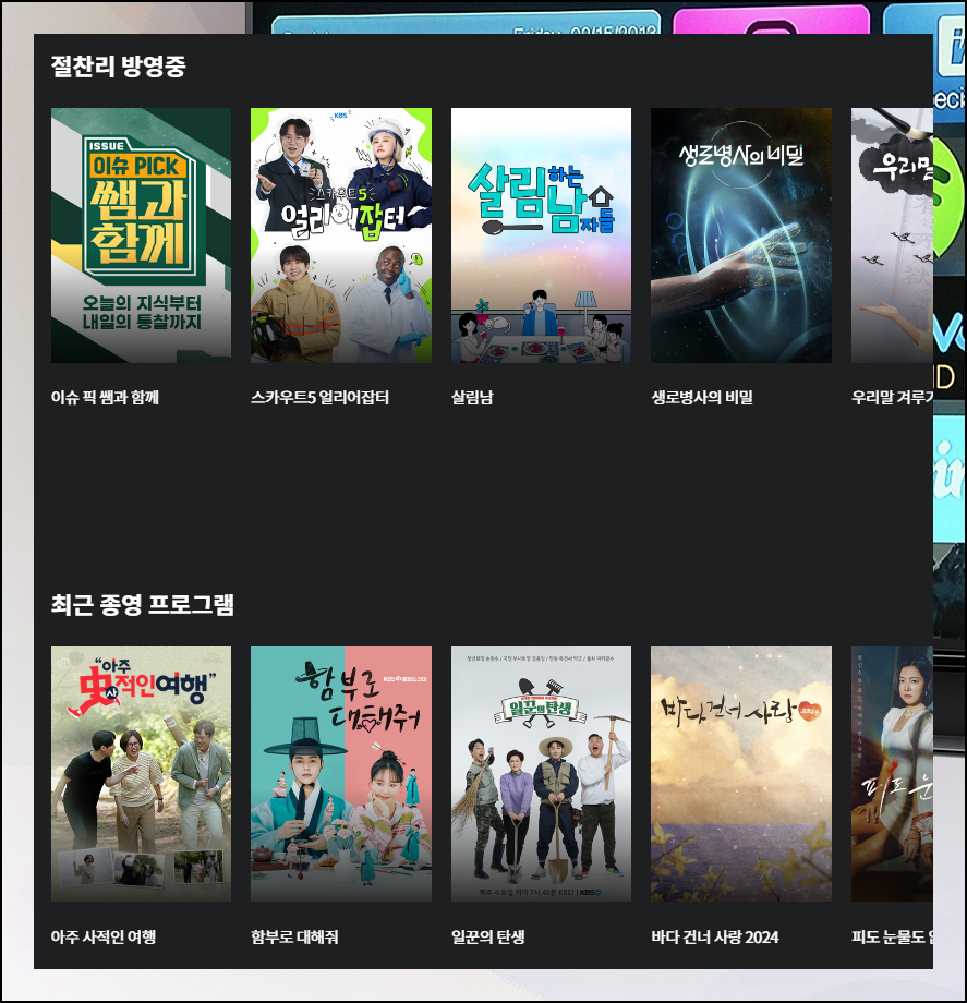 요즘에는 참 볼거리가 많습니다. TV는 물론이고, OTT나 유튜브 등 다양한 매체를 통해 재미있는 방송을 볼 수 있죠. 좋아하는 TV 프로그램을 놓쳤다면 제가 알려드리는 사이트 2가지를 이용해 보세요. 예능이나 드라마는 물론이고, 다큐나 뉴스 등을 무료로 볼 수 있습니다. 현재 방영이 되는 작품은 물론이고, 과거에 완결된 작품도 다시 볼 수 있어요.