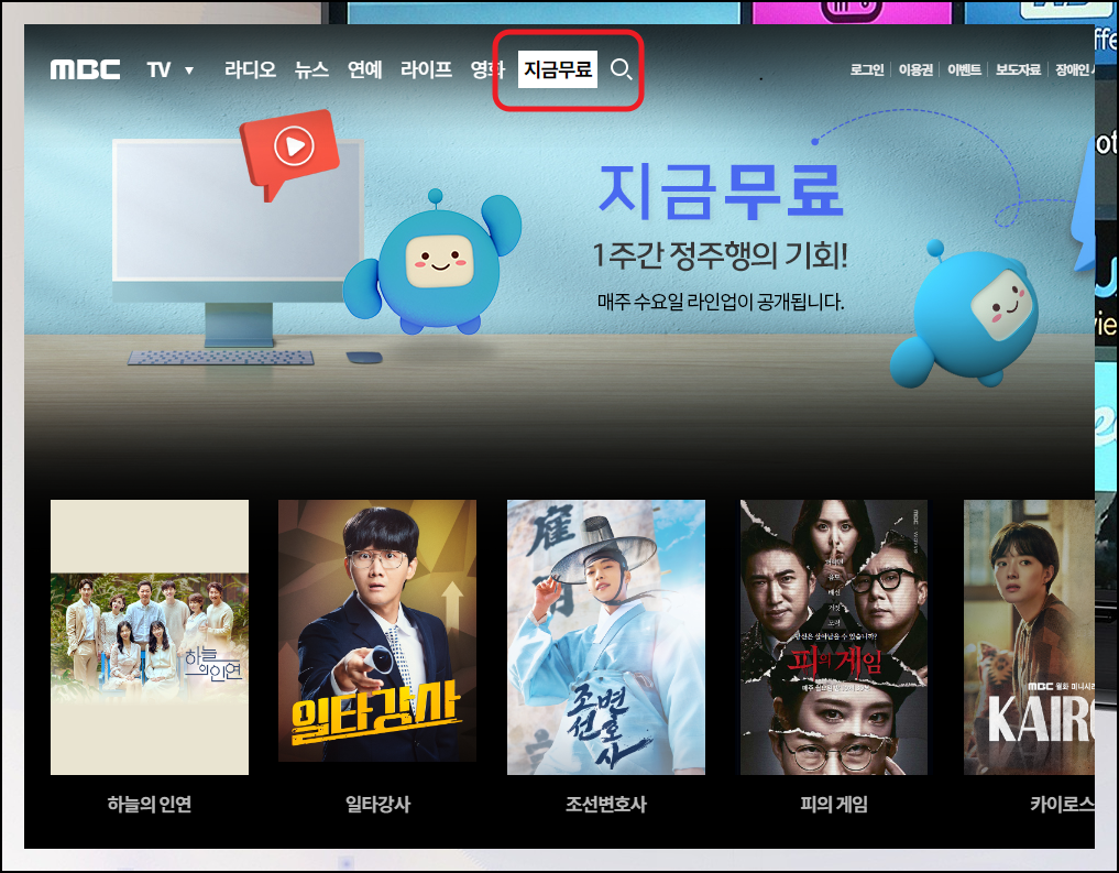 MBC 공식 홈페이지에서도 무료 다시보기 서비스를 제공하고 있습니다. MBC 사이트에 접속하면 "지금 무료" 메뉴를 찾을 수 있는데요. 꽤 많은 작품을 무상으로 감상할 수 있도록 되고 있습니다. 이곳도 함께 이용하면 좋을 것 같아요.