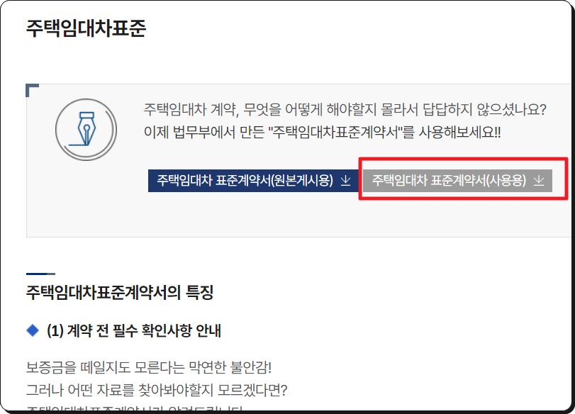 빈 칸을 채워 넣는 식으로 작성하면 되기 때문에 누구나 어렵지 않게 계약서 작성이 가능합니다. 뒷페이지로 이동해보면 안전한 계약을 위하여 꼭 알아야 하는 필수 사항도 있어요.