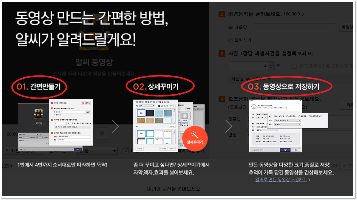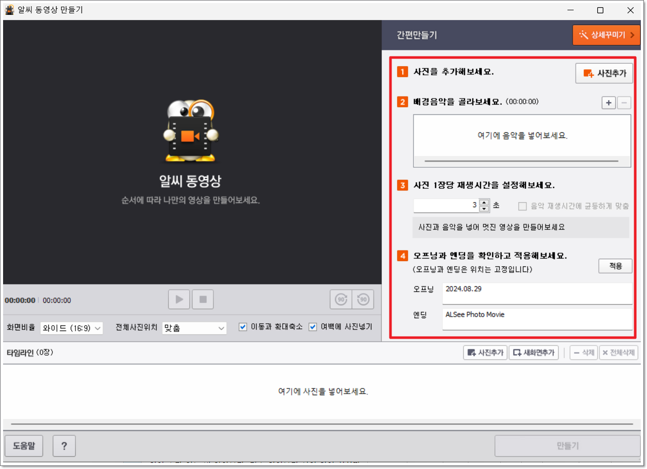 알씨 동영상 만들기 창이 열렸는데요. 여기에 사진 추가, 배경음악 선택, 재생시간 설정, 오프닝과 엔딩 문구 삽입을 하면 간단히 비디오 파일을 만들 수 있습니다. 좀 더 멋지게 꾸미고 싶다면 우측 상단에 있는 [상세 꾸미기] 버튼을 눌러보세요. 자막, 디자인, 효과 부분에 있어서 좀 더 고퀄리티의 작업을 진행할 수 있습니다.