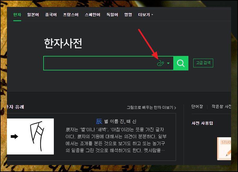 요즘에는 옥편 보기가 어려워졌어요. 아무래도 컴퓨터나 스마트폰을 이용하여 한자를 찾는 방식이 더 효율적이기 때문이죠. 네이버 사전 사이트를 통해 어떻게 한자 써서 찾는지 그 방법을 알려드릴게요. 사이트에 접속하면 검색창 안에 있는 [필기] 모양의 아이콘을 클릭하시길 바랍니다.