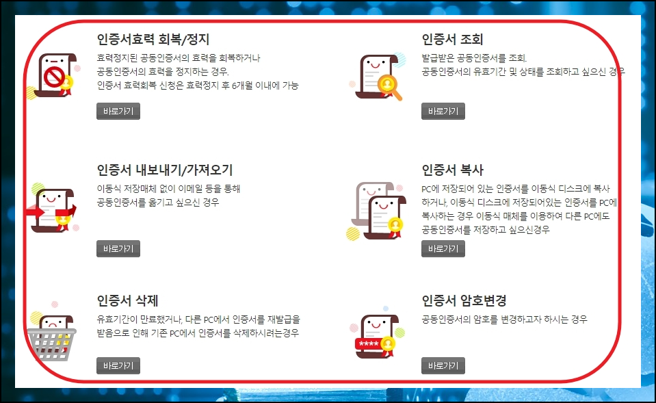 추후 무료공인인증서를 사용할 때 문제를 겪거나 관리가 필요할 때에는 이렇게 주거래 은행 사이트를 이용하면 됩니다. 암호변경, 복사, 조회, 내보내기, 가져오기, 삭제, 효력 회복 등의 관리를 진행할 수 있어요.