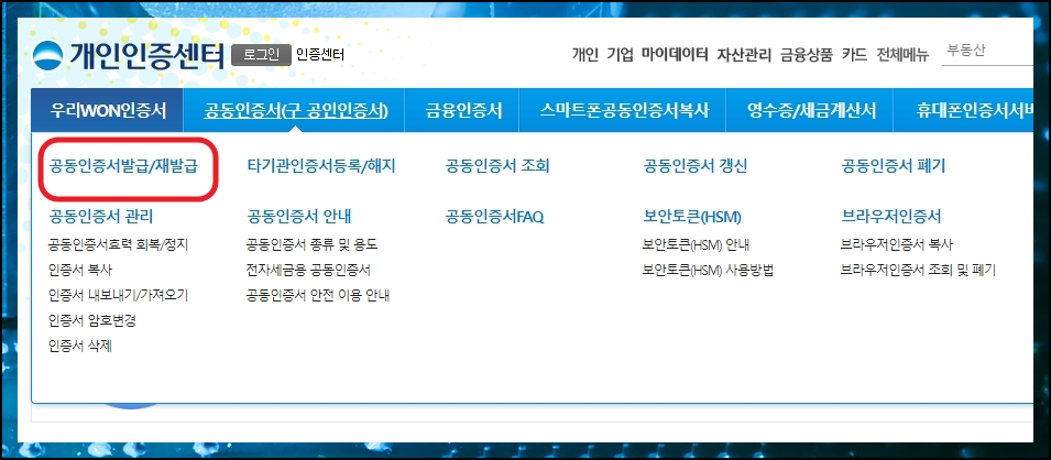 사람마다 많이 이용하는 주거래 은행이 있습니다. 제 경우에는 과거에 우리은행을 주로 이용했는데요. 이러한 주거래 은행을 이용하면 무료공인인증서를 발급 받을 수 있어요. 사이트에 접속해서 어떻게 진행하는지 그 방법을 알려드릴게요. 어떤 은행이든지 사이트에 접속하면 "인증센터" 메뉴가 있습니다. 해당 메뉴를 선택해 주세요.