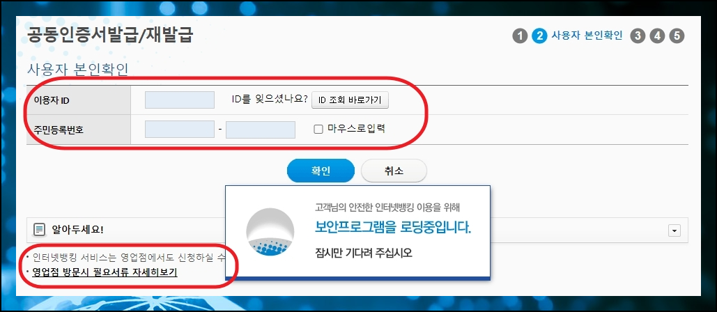종류 선택 이후에는 본인 확인을 위해 몇 가지 정보를 입력해야 하는데요. 보통 주거래 은행을 이용할 때 처음에 지점 직원으로부터 인터넷뱅킹 서비스를 신청하라는 이야기를 들었을 겁니다. 이에 따라 신청하는 경우가 많은데요. 그렇지 않았다면 영업점을 방문하여 인터넷뱅킹 서비스를 신청해주세요. 그래야 무료공인인증서 발급 진행이 가능합니다. 필요한 서류가 있을 수 있으니 여기 표시된 내용을 참고해 주세요. 보통은 신분증만 있으면 됩니다. 본인이 아닌 대리인 자격으로 갈 때에는 여러 가지 서류가 필요하긴 하죠.