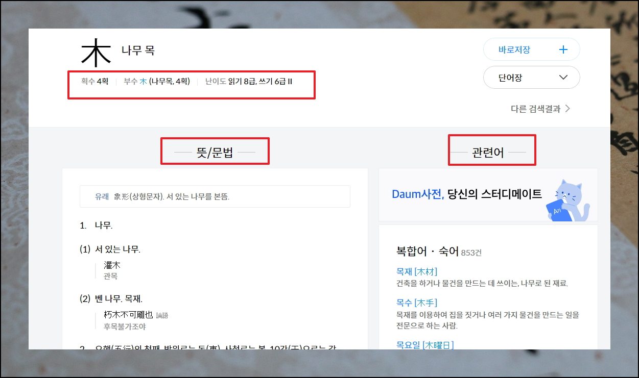 검색 결과에서 나무 목을 선택하면 이에 대한 다양한 , 문법, 관련어 등의 사전 정보가 나타나요. 어느 옥편보다 다음에서 제공하는 온라인 사전에서 제공하는 정보가 더 많다는 것을 알 수 있어요.