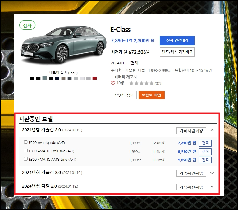 2024년 8월 판매순위를 살펴보겠습니다. 한국수입자동차협회 홈페이지를 이용하면 수입차에 대한 다양한 통계지표를 확인할 수 있는데요. 월별 브랜드의 판매순위만 무료이고 나머지는 유료로 확인할 수 있기 때문에 전 다나와를 이용한답니다. 지난달에는 벤츠의 신형 E-Class가 1위를 차지했네요. 2위 모댈에 비해 2배 이상의 판매량을 보이고 있네요.
