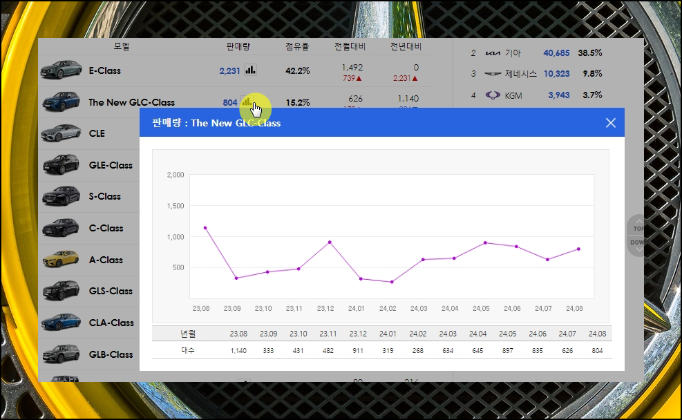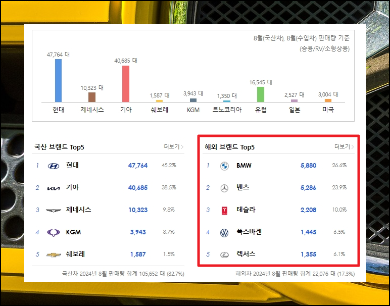 국내 소비자들의 선호도와 시장 트렌드를 반영하는 중요한 정보입니다. 더불어 이를 통해 각 브랜드의 인기 모델과 신차의 시장 반응도 파악할 수 있죠.