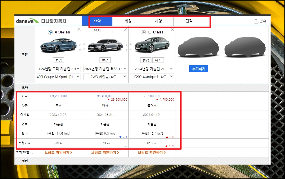 직접 여러 모델을 비교하는 것도 가능해요. 전체적으로 보고 싶을 땐 순위를 참고하는 것이 좋지만, 마음에 드는 몇 가지를 비교해보고 싶을 때는 모델비교기능을 사용하면 편리합니다. 간단하게 ②번(추가하기)을 클릭한 후 모델을 지정하면 되는데요. 화면에서는 잘렸지만 가격, 중고시세, 차량종류 외에 제원, 사양, 옵션, 조건, 구입비용 등의 다양한 비교가 가능합니다.