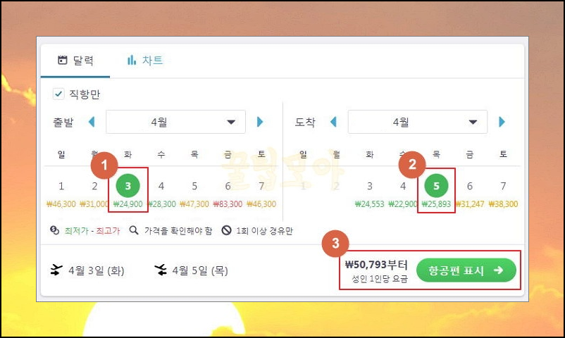 사이트에 접속하면 가장 먼저 원하는 비행기표에 대한 조건을 지정해야 합니다. 출발지, 도착지 등을 입력하시면 되는데요. 여기서 주의하실 점은 '직항만'에 체크를 하고, 날짜는 '한 달 전체'로 해야 합니다. 이렇게 해야 최저가로 싸게 살 수 있는 티켓을 구하기가 수월해요.