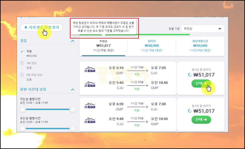 항공편을 선택해야 하는데요. 원하는 항공사가 있으신가요? 요즘에는 저가항공사가 많은데요. 직접 이용해보니 대형항공사와 큰 차이는 없었습니다. 추천순으로 정렬을 하면 최적의 가격과 여행시간에 맞춰 비행기표를 추천해줍니다. 가격이 마음에 들지 않는 경우에는 왼쪽 위에 있는 알림 박기 버튼을 눌러주세요.
