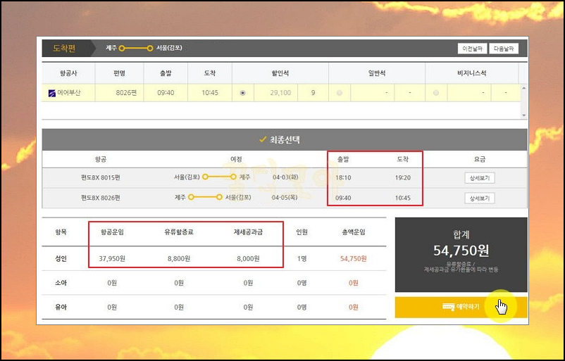 업체를 선택하면 예약을 할 수 있는 사이트로 이동하게 되는데요. 여기에서 항공운임, 제세공과금, 유류할증료 등을 꼼꼼히 확인하신 후 예약을 진행하면 됩니다.