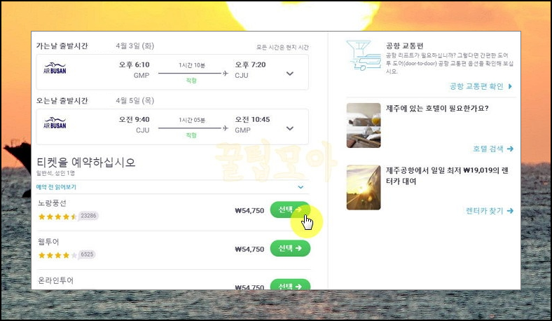 항공편이 마음에 들어 선택 버튼을 클릭하면 예약을 할 수 있는데요. 일단 업체를 선택해야 합니다. 가격이 낮고 별점이 높은 곳을 선택하는 것이 좋아요.