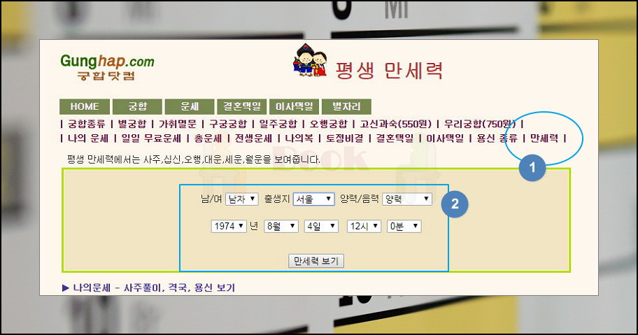 궁합닷컴 홈페이지에 접속해 보시면 아시겠지만, 많은 운세 서비스가 무료로 제공되고 있어요. 토정비결 보기, 이사 및 결혼 택일에 관한 달력 등을 살펴볼 수 있어요. 만세력 보는 방법은 간단한데요. 성별, 출생지, 양력 및 음력, 태어난 날짜와 시각을 차례대로 입력해 주세요. 다 입력하셨으면 [만세력 보기] 버튼을 클릭하면 됩니다.
