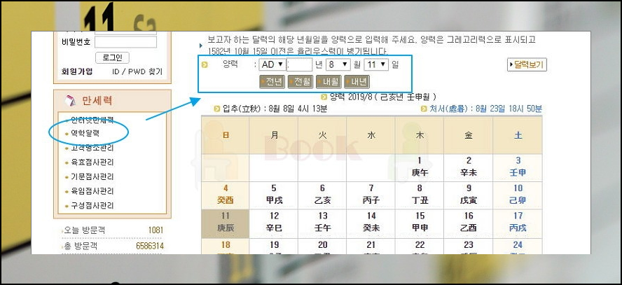보고 싶은 날짜에 해당하는 년월일을 양력으로 입력해 주세요. 그럼 이에 맞는 역학 달력이 나타나요.