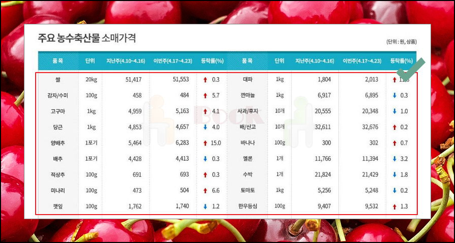9. 소매가격 비교 및 분석해보세요. 주요 농산물 소매가격을 조회해 보세요. 풍목, 단위, 지난주 및 이번주 시세, 등락률로 구성된 표를 통해 여러 가지 품목을 한 눈에 보고, 비교할 수 있어요.