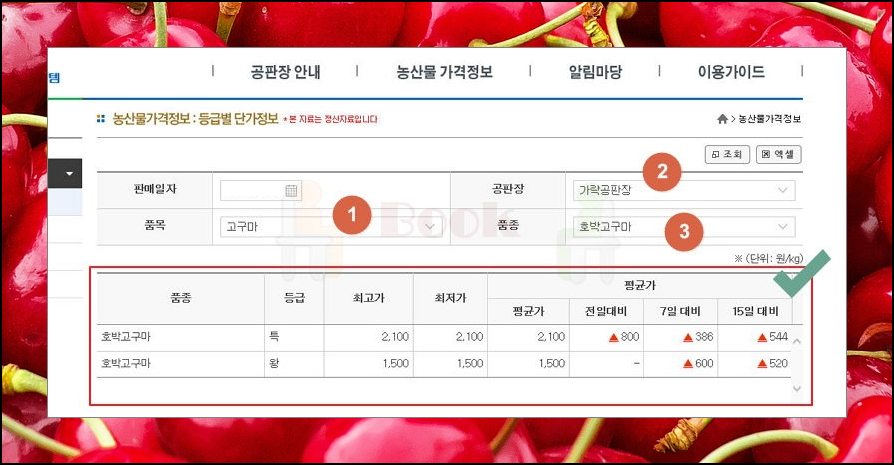 3. 가격정보 페이지가 열렸어요. 판매일자, 공판장, 풍목, 품종을 차례대로 지정해 보세요. 저는 가락공판장에서 거래가 된 호박고구마를 확인해 보았어요. 이렇게 선택한 품종에 대한 등급, 최고가, 최저가, 평균가 등의 시세를 확인할 수 있어요.