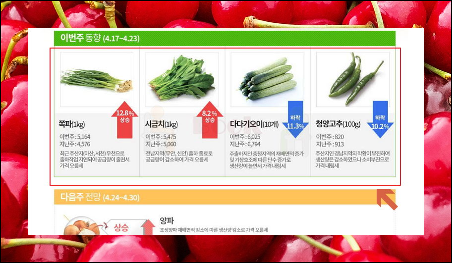8. 주간 동향과 전망 살펴보세요. 메뉴에서 [동향/전망]을 클릭해 보세요. 그럼 일주일 단위로 농수산물 시세조회를 할 수 있어요. 사진, 상승 또는 하락 이유, 이번주와 지난주 금액을 확인해 보세요. 그래프를 통해 가격 상승 또는 하락을 손쉽게 확인이 가능하실 수 있어요.