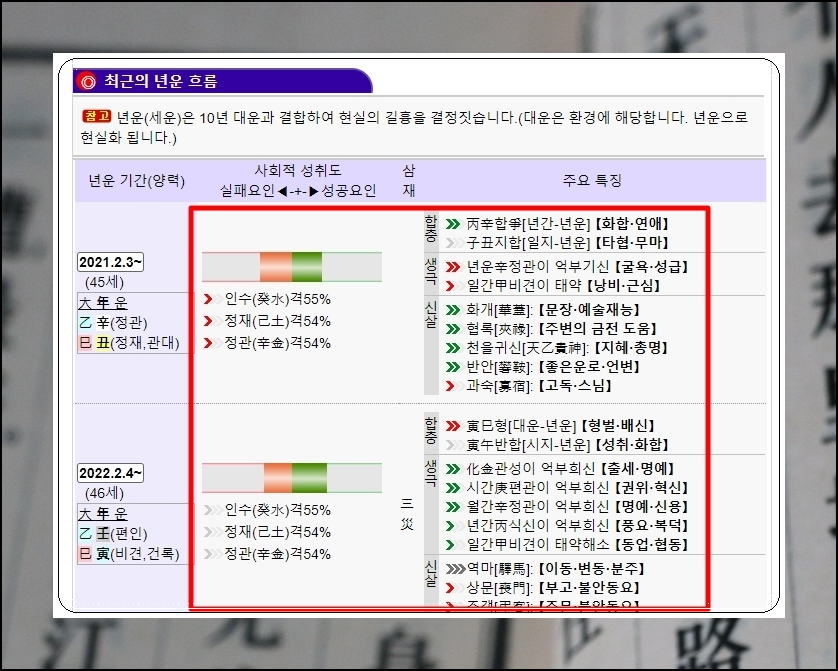 7. 대운과 연운 정보를 파악합니다. 만세력에서 빠질 수 없는 것이 대운과 연운입니다. 10년 그리고 1년 마다 찾아오는 운이라고 할 수 있는데요. 이러한 것들은 우리 인생에 큰 흐름을 결정 짓는 다고 합니다. 조금 어렵게 작성이 되어 있지만, 해당 사이트에서 제공하는 교육자료나 관련 게시물을 보면 좀 더 수월하게 해석할 수 있어요.