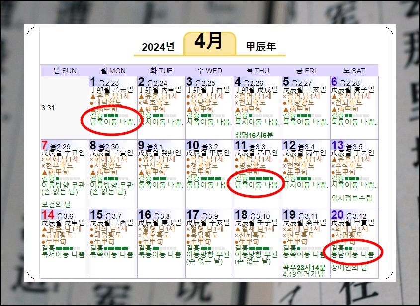 1. 달력으로 길흉을 살펴봅니다. 제가 소개해 드릴 2가지 무료 만세력 서비스 중에 첫 번째는 위와 같이 달력 모양으로 되어 있습니다. 매일마다 길흉에 대한 정보를 얻을 수 있는데요. 어느 방향으로 가면 나쁜지도 표시가 되어 있어요. 아마도 이사를 할 때 참고하면 좋을 것 같습니다.
