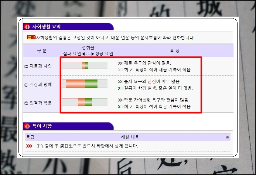 6. 성향과 사회생활을 무료로 들여다봅니다. 사회생활에 대한 부분도 이곳에서 자세하게 알아볼 수 있는데요. 자신의 성향에 대해 알 수 있는 기회를 줍니다. 자신이 재물, 출세, 학문에 관심이 많은지 또는 아닌지 헷갈리는 분들은 꼭 한 번 이용해 보세요.