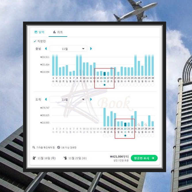 검색을 누르면 그날의 최저가 티켓의 금액이 표시된 달력이 나타나는데요. 이러한 금액이 낮은 날일수록 그날에 저렴한 티켓이 많을 확률이 높겠죠? 찾아보니 왕복으로 42만원대가 나오네요. 일반적인 방법으로 예매하신다면 이보다 비쌉니다.