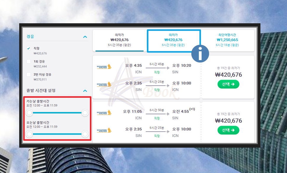 여행을 간다면 낮에 출발하고, 밤에 돌아오는 것이 좋겠죠? 메뉴에서 가는날과 오는날의 출발시간을 설정해보세요. 조건에 맞는 최저가 항공권을 찾아줍니다. 6만원을 절약할지, 마음에 드는 시간대에 싱가포르 여행을 떠날지 선택하시면 돼요.