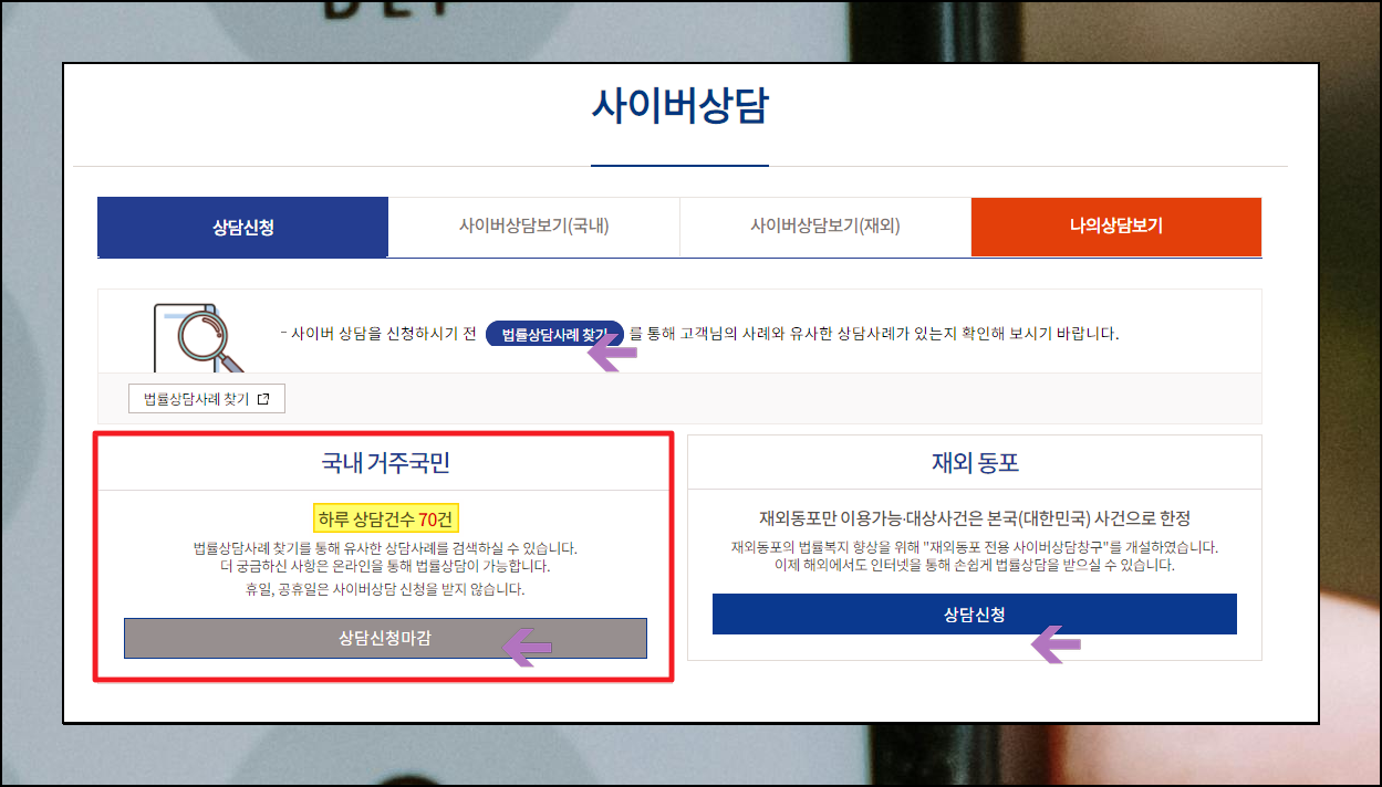 앞서 언급한 [사이버] 메뉴를 선택해보았습니다. [신청] 버튼을 누른 후, 궁금한 점을 글로 입력하면 되는데요. 하루 이용용건수는 70건 입니다. 그리고 공휴일과 휴일은 사이버 상담에 대한 신청을 받지 않는다고 하네요. 참고로 해당 서비스를 이용하기 이전에 화면에 나와 있듯이 [사례 찾기] 버튼을 클릭해 보세요. 그럼 나의 상황과 유사한 사례가 있는지 확인할 수 있습니다. 여기에는 답변도 포함되어 있기 때문에 유사사례 조회를 통해 해결책을 얻기도 합니다.