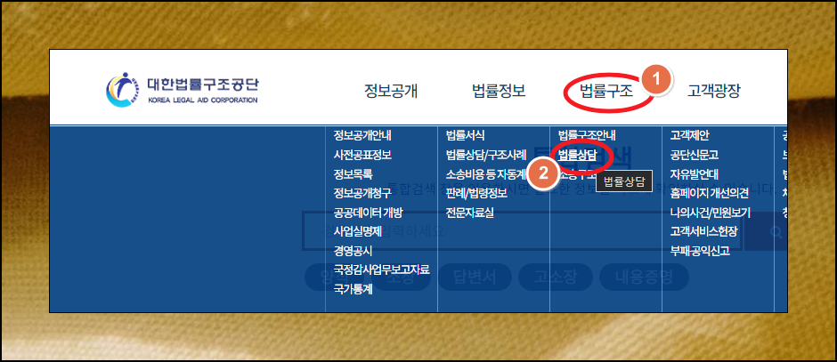 사이트에 접속하면 메뉴에 정보공개, 법률정보, 법률구조, 고객광장 이렇게 네 가지가 나타납니다. 여기에서 [법률구조]를 선택한후, 하위 메뉴에서 [법률상담]을 클릭해주세요.