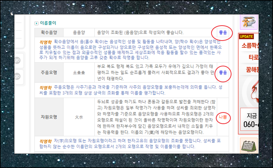 또 다른 이름풀이 결과를 무료로 살펴볼게요. 성명학 이론에 속하는 획수음양, 주음오행, 자원오행을 통해 살펴본 것인데요. 간단하게 좋음 또는 나쁨으로 표시되어 있어요. 해당 결과를 간단히 살펴보고, 검은 색 글씨로 된 사주풀이 내용을 무료로 읽어볼 수 있습니다.