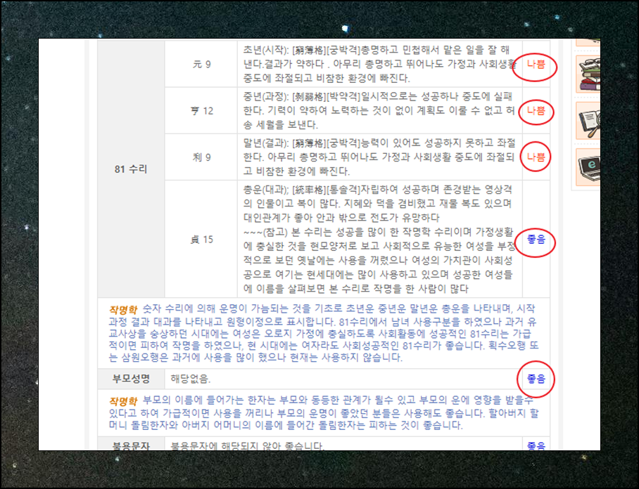 81 수리를 통해 초년, 중년, 말년, 총운에 대한 부분을 사주풀이 할 수 있는데요. 제가 입력한 바에 의하면 초년, 중년, 말년은 모두 나쁘고, 총운은 좋네요. 이를 통해 무료 사주풀이 서비스라고 해서 무조건 좋은 결과만 나오는 것이 아니란 것을 알 수 있어요. 여기에 더하여 부모 성명을 참고했을 때 좋은지 여부 그리고 작명할 때 중요한 불용문자 여부를 확인할 수 있습니다.