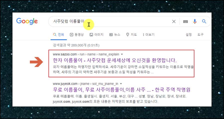 사주풀이를 할 수 있는 사이트는 많지만, 성명을 가지고 풀이해주는 곳은 거의 없어요. 제가 직접 여러 곳을 찾아본 바에 의하면 사주닷컴의 이름풀이 서비스만큼 퀄리티 높은 곳이 없더군요. 구글에서 간단한 검색을 통해 해당 서비스로 바로 이동할 수 있는데요. "사주닷컴 이름풀이"라고 검색해야 돼요. 그럼 바로 접속이 가능해요.