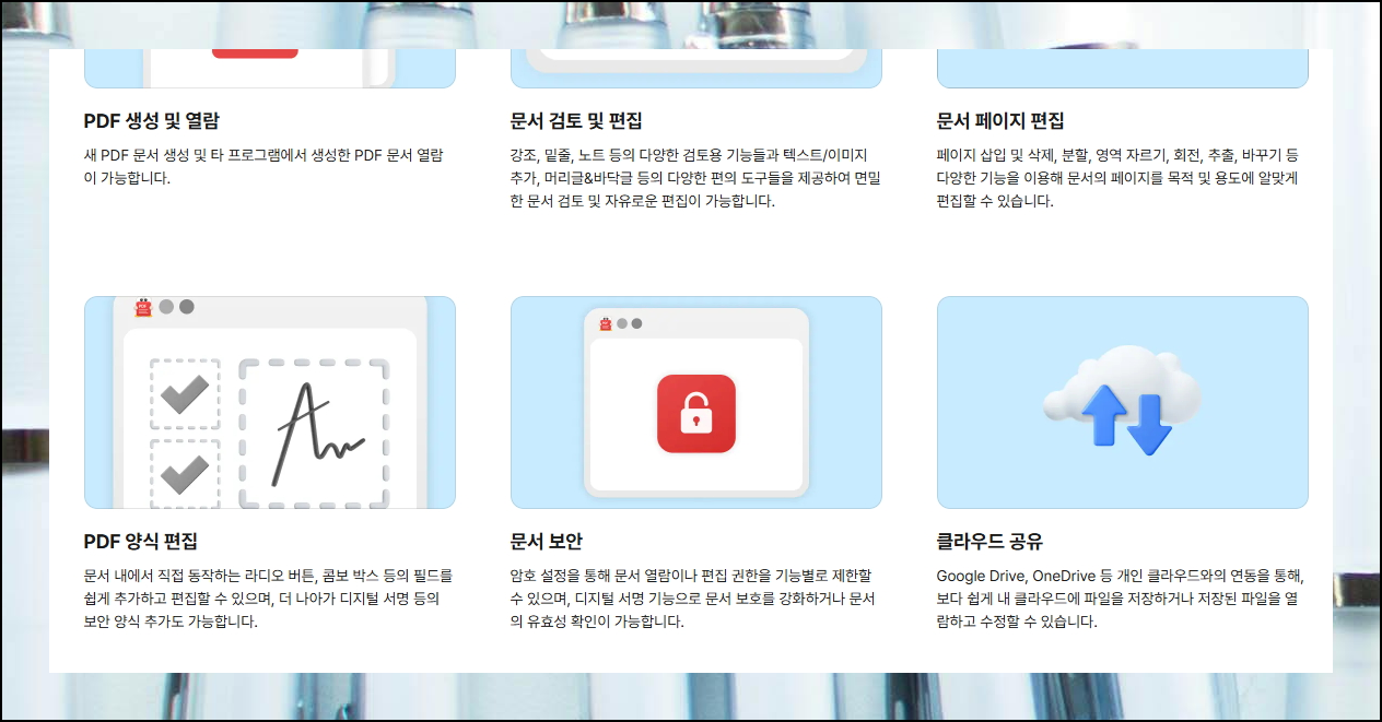 다양한 종류의 문서 포맷으로 쉽게 변환할 수 있어요. 게다가 시중의 다른 무료 pdf 프로그램들이 제공하는 기본적인 편집 기능도 모두 사용하실 수 있습니다.