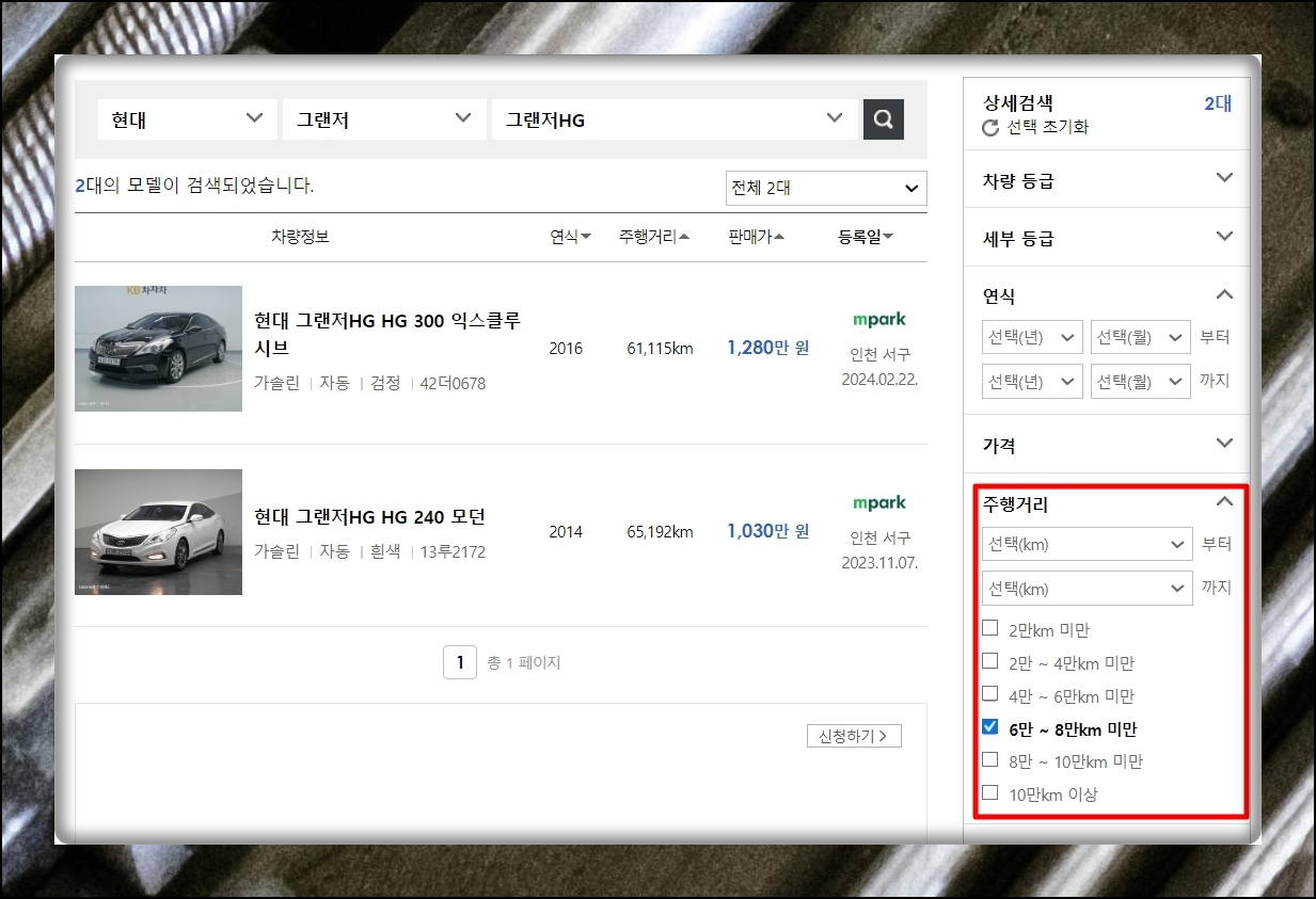 저는 주로 주행거리 위주로 살펴보는데요. 제가 원하는 조건에 맞는 차량 매물이 2건 나왔네요. 각자 어느 매매단지에 있는지 확인할 수 있고, 언제 등록이 되었는지도 알 수 있습니다. 여기서 좀 더 상세하게 알아보고 싶으면 차량 정보 부분을 클릭해 보세요.