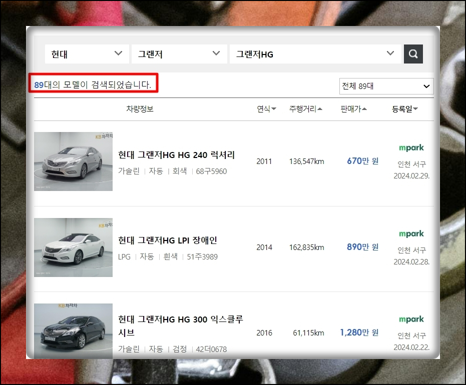 저는 매물이 많은 축에 속하는 그랜저HG를 선택했는데요. 간단한 시세표가 나타났습니다. 이를 통해 가격은 물론이고, 다양한 중고차 정보를 한눈에 볼 수 있습니다. 우측에 보면 상세 검색 기능을 이용하여 원하는 조건의 매물만 골라서 가격을 비교해 볼 수도 있습니다.