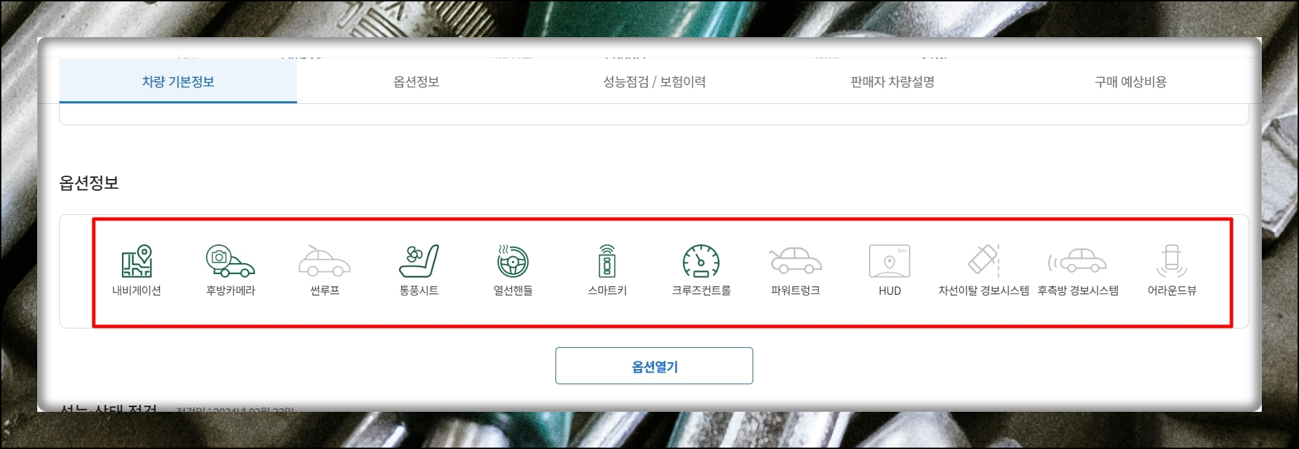 사진을 확인한 다음에는 차량의 기본 정보, 옵션, 성능, 이력 등을 꼼꼼히 살펴보는 것이 중요한데요. 중고로 구매하는 경우에는 차량 옵션이 정해져 있습니다. 평소 본인이 원하는 옵션이 장착되어 있는지 꼼꼼히 살펴보세요.